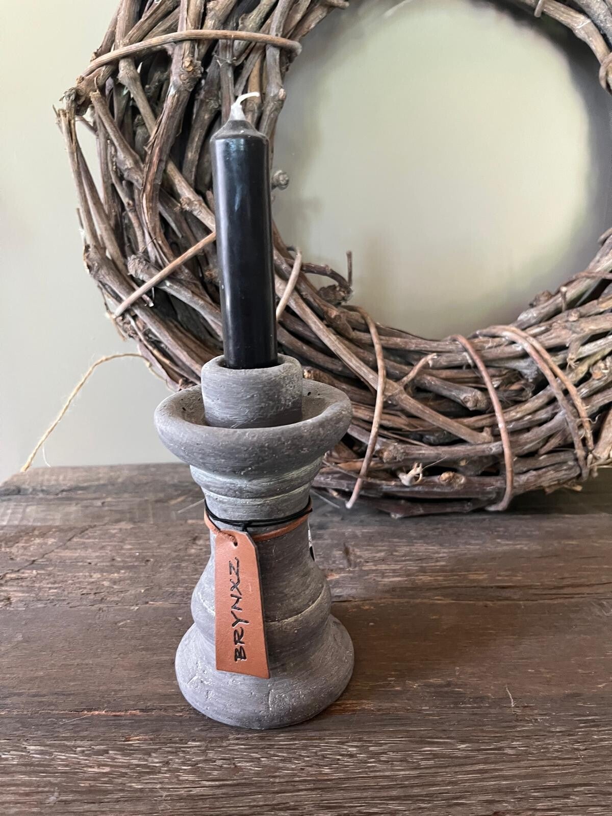 Deze grijze betonnen kandelaar van Brynxz met een Zwart dinerkaarsje heeft een stoere uitstraling. Een stijlvolle toevoeging aan je huis!